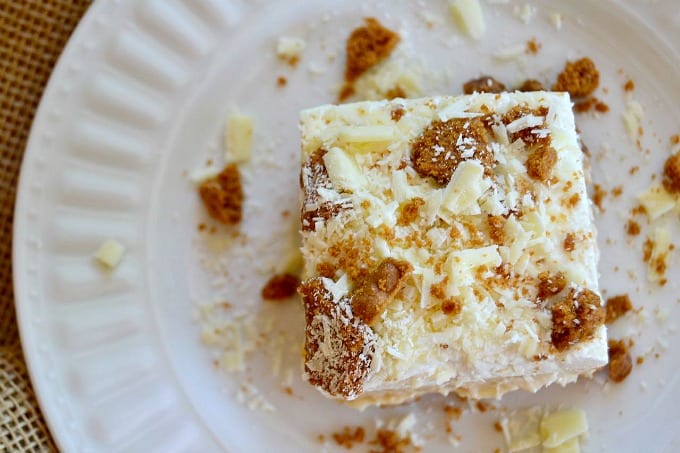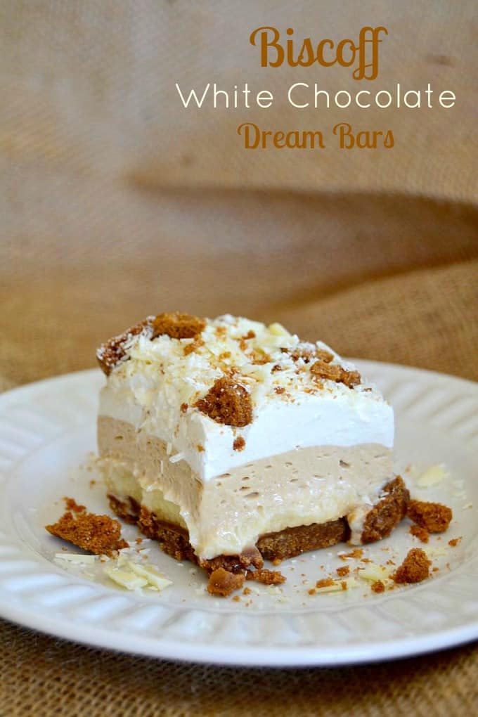 Biscoff White Chocolate Dream Bars – crushed Biscoff cookies, Biscoff Cookie Spread, and White Chocolate Pudding make these NO-BAKE bars an unbelievable dessert, perfect to serve anytime!